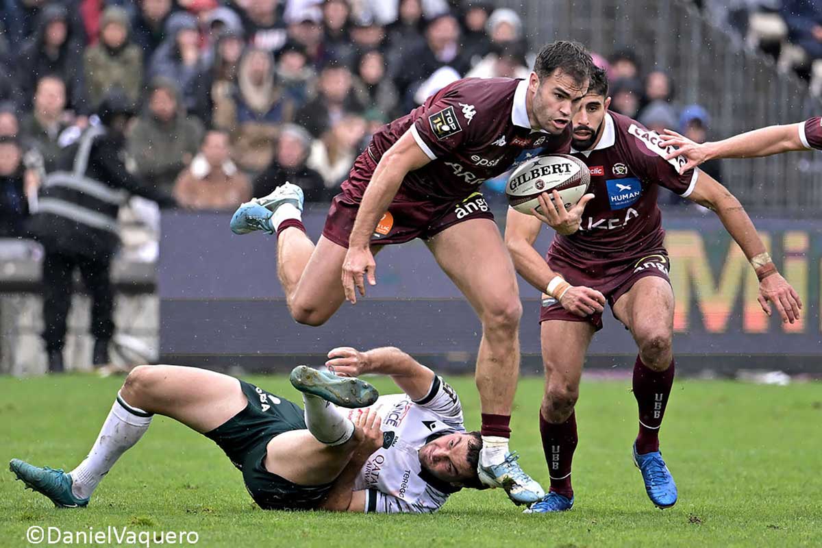 Sous cette pluie régulière pas forcément violente mais terriblement gênante, le jeu au pied a été très important durant cette partie parfois pas très enthousiasmante. Dans cette grisaille on a assisté à la cinquante et unième minute à une belle intervention de Jalibert arrivé à toutes jambes pour faire bénéficier d’un magnifique service Bielle-Biarrey pour aller marquer comme dans un fauteuil. Il est évident que la longueur du jeu au pied de Lucu sur les sorties de camp comme celui de Jalibert dans le jeu ouvert a tenu les palois loin des lignes des locaux leur rendant toutes velléités d’attaques difficiles. Ceci s’est traduit à l’affichage par un maigre score de six points pour les visiteurs en fin de rencontre. Il faut constater que le dézonage pratiquement systématique des ailiers avec en plus les montées saignantes de Buros créent une grande incertitude dans la défense adverse permet aux bordelo-béglais de scorer même dans des conditions difficiles comme les 32 515 présents ont pu le constater. Malgré tout, le problème de la touche subsiste car on n’arrive pas à retrouver une rampe de lancement correcte depuis les saisons passées. Il faut constater que sur ce match, autant Lucu que Jalibert ont montré une forme internationale et cela risque de poser des problèmes de choix à Galthié pour cette fenêtre internationale de l’Automne.