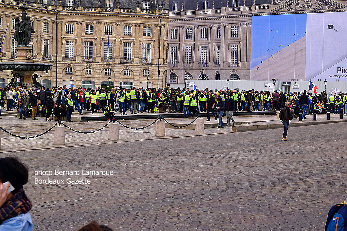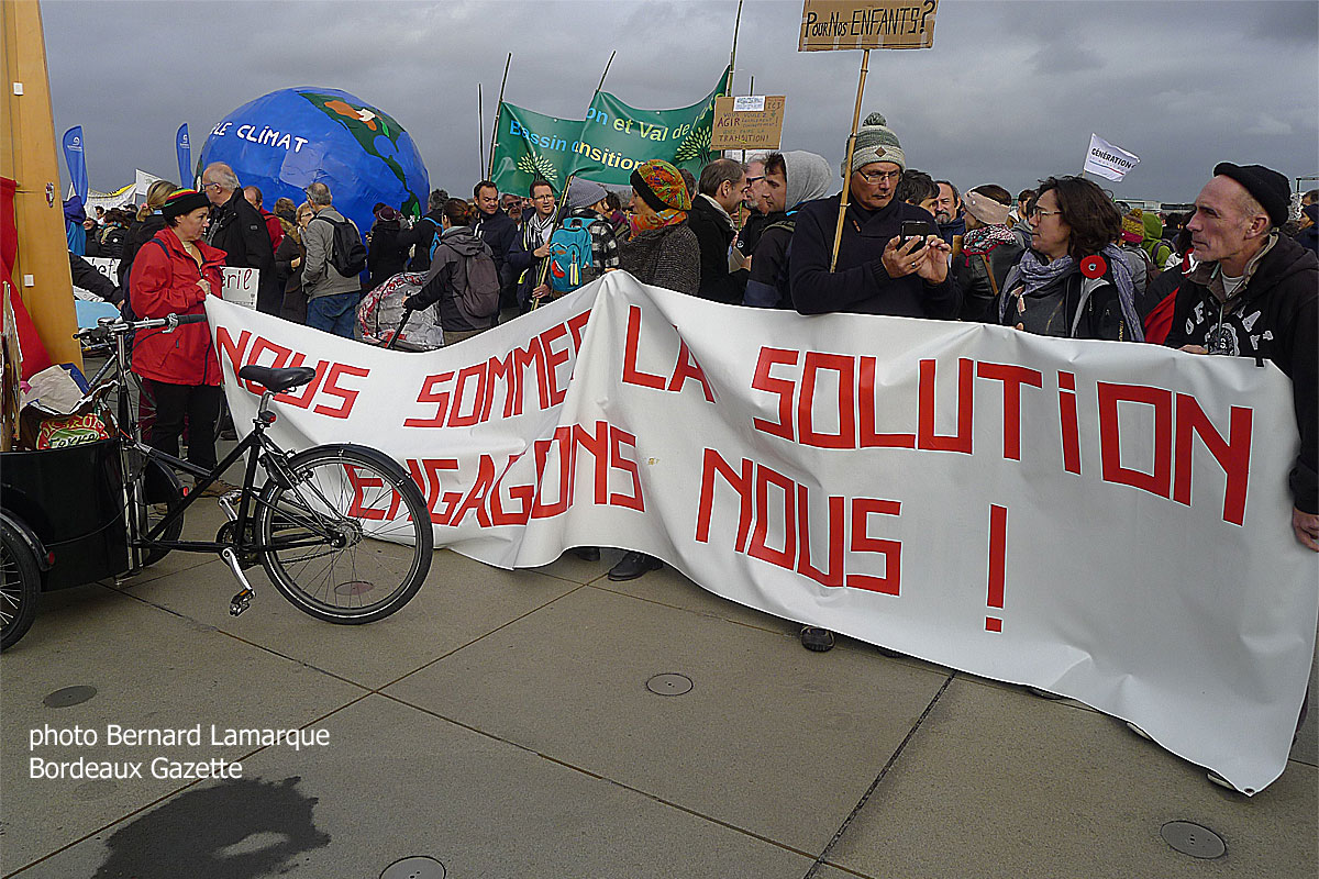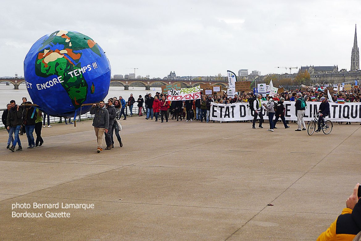 Sur le coup de 14 heures on avait le rassemblement des gilets jaunes place de la Bourse et le rassemblement de la marche pour le climat sur le miroir d’eau créant le sentiment étrange d’une séparation alors qu’à écouter les uns et les autres les mots d’ordre étaient proches de l’identique avec d’un côté les écologistes qui devaient marcher pour le climat avançant : " prendre en compte la fracture sociale et territoriale sans renoncer ni à la protection du climat ni à la justice sociale et réconcilier celles et ceux qui appréhendent la fin de mois comme la fin du monde " alors que du côté gilets jaunes on mettait plutôt en avant le départ de Macron sans cris ni slogans bruyants, mais de manière ferme et convaincue comme seul issu à la crise avec quelques coups de griffe sur les émoluments des haut-fonctionnaires et du personnel politique. Alors que les gilets jaunes rejoignaient un autre cortège en cours de constitution vers le sud, le cortège pour le climat s’ébranlait vers le Nord avec en tête une forte participation d’Aux arbres citoyens afin de rejoindre le cours de la Martinique, puis le cours Portal, le cours de Verdun et la place Gambetta pendant que l’hélicoptère de la gendarmerie faisait des ronds dans le ciel pour surveiller les deux cortèges qui étaient formés. Le premier devant se terminer vers 16 heures mais une fois ce dernier terminé, un certain nombre ont décidé de rejoindre l’autre cortège.