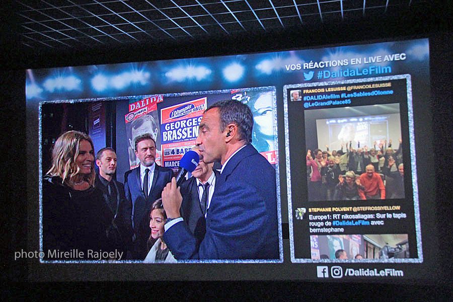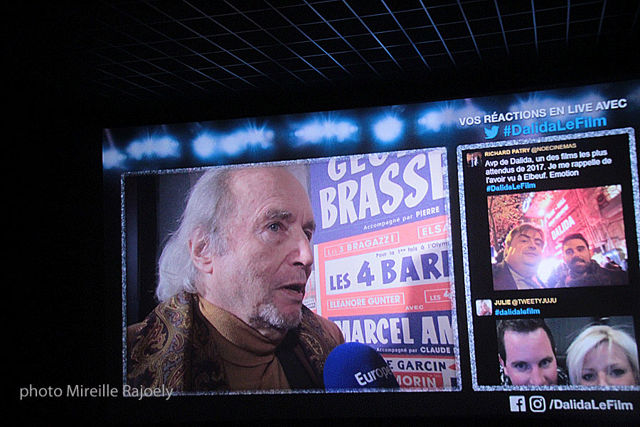 C’est au Gaumont Talence Universités que l’on a pu assister à cette avant première qui avait lieu dans tous les cinémas Pathé grâce a une diffusion satellite qui même si elle a donné lieu à quelqes soucis de connexions, une fois celle-ci établie les spectateurs de Bordeaux déjà installés dans leur fauteuil ont pu suivre l’arrivée des artistes qui sont venus à l’Olympia pour visionner le film dans lequel ils figurent mais qui ne sortira que le 11 janvier. C’est ainsi que les spectateurs ont pu voir Jean Sobieski, le vrai incarné par Niels Schneider dans le film, qui reste un des hommes avec qui elle a partagé des moments intimes qui n’a pas connu un sort tragique et qui est toujours de ce monde, qui s’est dit très exité à l’idée de voir le film qu’il n’a pas encore vu car "tout cela remonte au dela de 50 ans, elle aurait 83 ans maintenant et on va retrouver une jeune femme sur les écrans" Il a avoué que quand il est devenu son ami il ne savait même pas qui c’était et il l’a appris par la suite et il a "cela a été une relation courte et intense" car il est vrai qu’à cette époquie elle vivait avec Lucien Morisse. Il a précisé qu’après leur rupture il avait conservé d’excellentes relations avec Dalida et qu’ils se rencontraient à l’occasion toujours avec plaisir. Pour cette avant-première Patrick Timsit en tournée ne pouvez être là, car dans le film il joue de rôle de Bruno Coquatrix qui a tenui un rôle important dans la carrière de Dalida mais il avait laissé une vidéo pour manifester sa présence.