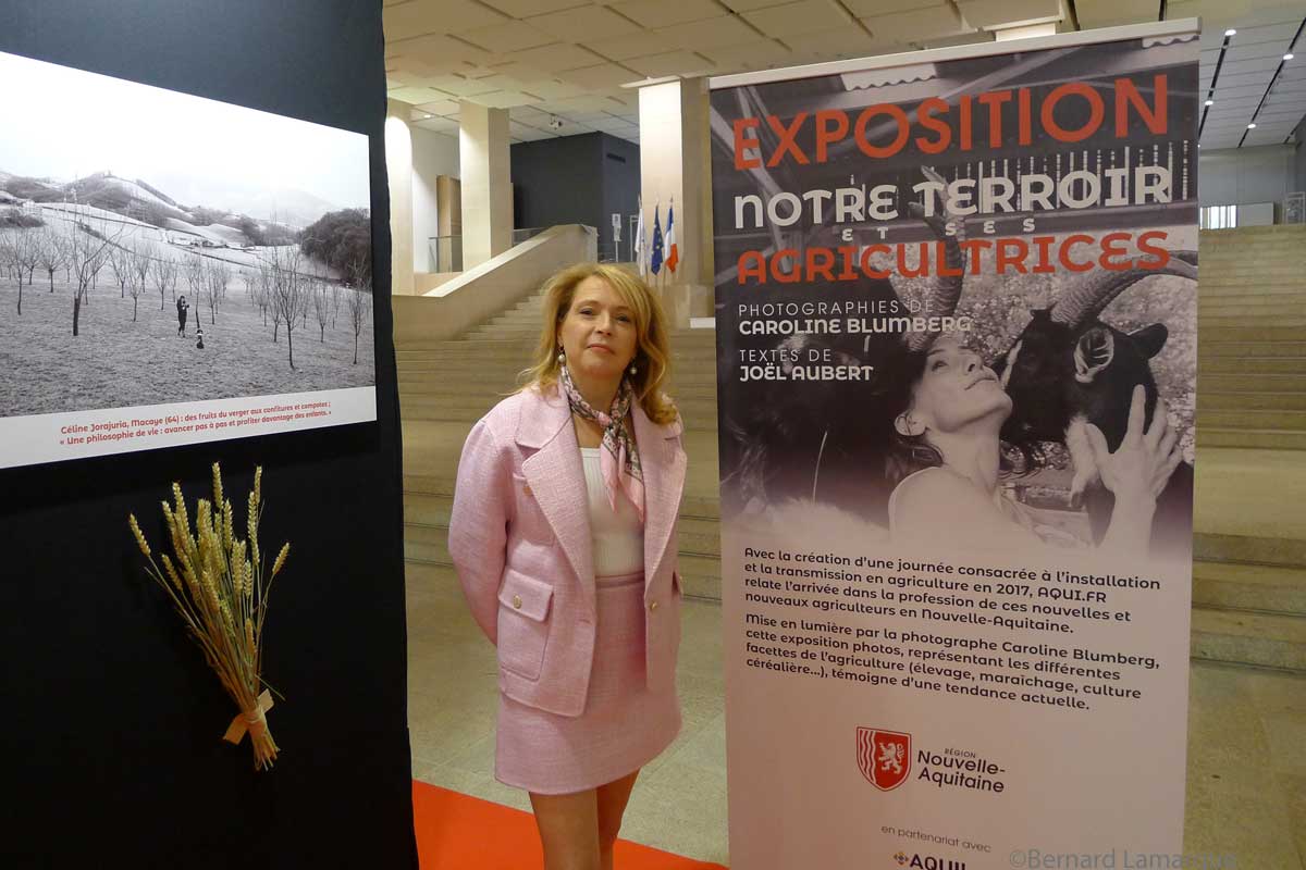 Comme le rappelle Caroline Blumberg, Joël Aubert le fondateur d’Aqui avait rencontré, avant qu’elle ne réalise les photos, tous les personnages mis en scène dans cette exposition qui tenait beaucoup à cœur à son instigateur mais qui malheureusement n’a pas eu le loisir de découvrir le travail achevé dont il avait écrit tous les textes. Le début de la réalisation de ce travail de mise en valeur de l’activité féminine dans le milieu agricole avait débuté avant la crise du Covid qui a considérablement freiné la réalisation des photos nécessaires à finaliser l’exposition. Ainsi cette exposition est comme un hommage à celui qui l’avait imaginé mettant en scène des agricultrices de la Nouvelle Aquitaine pour mettre en évidence les différentes facettes de l’agricultrice (élevage, maraichage, culture céréalière, ostréiculture...) domaines que les femmes investissent de plus en plus. Il faut savoir que le terme agricultrice n’est apparu dans le dictionnaire qu’en 1961, comme s’est plu à le rappeler Alain Rousset lors de son allocution comme il a souligné l’activité de Lydia Héraud au Conseil Régional, en viticulture ce n’est qu’en 1980 que les femmes ont obtenu le statut de co-exploitante. Comme elle, comme pour Julie Rapet, aujourd’hui pour les Talibans ce serait la double peine femme chef d’entreprise et fabricante d’alcool, mais ils sont plus intéressaient par l’opium que par la vigne qui pourtant est à la base des revenus agricoles du pays Afghan mais là-bas on ne vinifie pas on les consomme à table ou on les fait sécher, on y recense quand même plus de cent variétés de raisin.
