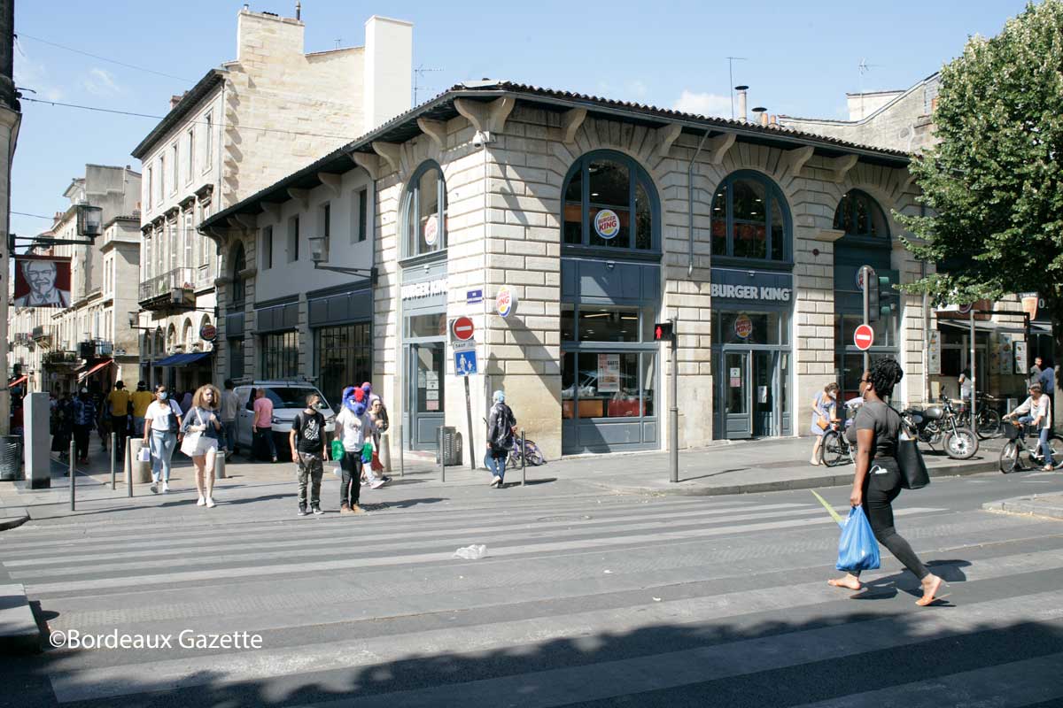 Avançons légèrement dans le temps, et dirigeons nous au Burger King à l’angle de la rue Sainte-Catherine et du cours Victor-Hugo. Oui, au Burger King, car cet édifice était une ancienne poudrière. Pour l’anecdote, l’hôtel de ville, qui était situé non loin du site ( il s’étendait sur 12 500 m2 de la Grosse Cloche à la rue Sainte-Catherine), fut touché par l’explosion de la poudrière le 13 décembre 1637. Un pâté entier de maison détruit en un instant. Suite à cet incident, le bâtiment devint une salle de spectacle jusqu’en 1698, moins dangereuse pour le quartier. Plus tard de 1728 à 1744, Abraham et David Gradis habitent l’immeuble, mais ceux-ci cèdent leur habitation, sous pression de la jurade qui avait pour ambition d’y construire le Grand Marché. Ce projet fut mis sur papier par la famille d’architectes Bonfin en 1796. Ils sont connu pour avoir réalisé le Palais Rohan et la fontaine de la Grave. Le Grand Marché ouvrit en 1806, et nous pouvons remarquer que la forme du bâtiment témoigne de ce passé : grandes arcades, haut plafond au rez-de-chaussée, les combles devait contenir les réserves.
