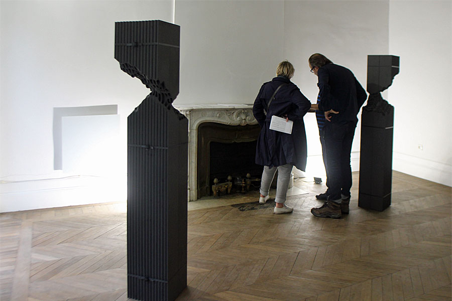 L’association des Parisiens de Bordeaux est très active dans l’organisation d’événements rassemblant des néo - bordelais. Toutefois, cet été elle s’est consacrée à l’art en réalisant avec l’agence Art et Communication deux expositions « fragmentations » de Vincent Mauger. Rue Raze, sont exposés à la fois des dessins et des sculptures de cet artiste nantais. Il s’approprie des matériaux ordinaires de construction briques, parpaing, tubes PVC, bois, acier, plaque inox, etc. pour en faire des formes inattendues. Trois sculptures occupent l’espace dans une pièce aux moulures et plafond du XVIIIème. Ce sont tout d’abord deux objets en fibre de carbone. Cela pourraient être deux jumeaux se faisant face à face. En effet, ils sont composés de façon identique, de lames ou de planches successives verticales collées les unes contre les autres dont elles semblent avoir été fracturées pour laisser la place en 3D de la vision de l’intérieur de la matière.